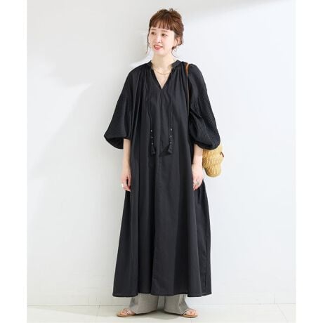 程よくゆとりのあるシルエットで体のラインを拾いにくく、顔まわりをすっきりと見せるスキッパーネックに襟元の銀糸を巻き付けたタッセル付きスピンドルが控えめながらも上品なアクセントになります。袖部分には別布を使用し、細かなピンタックを施すことで柔らかさのある立体感のある表情をプラス。ふんわりとした袖のフォルムが女性らしさを引き立て、袖口はゴム仕様で腕まくりしやすくしています。
