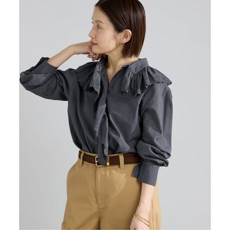 衿元に施したフリルは、甘くなりすぎない分量感に調整し、大人のスタイリングにも取り入れやすいデザインに。