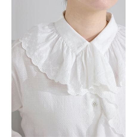 繊細なドビー織りのコットン素材に、カットワーク刺繍をあしらった表情豊かなフリルブラウス。