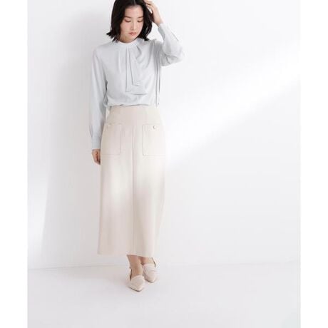 アウトポケットがポイントのナロースカート。アウトポケットに付けたゴールドカラーの縁取り釦がアクセントになり、上品でキレイめな印象を演出。程よいハイウエストと後ろウエストはゴム仕様で、ストレスフリーなはき心地です。後ろ裾のベンツで足さばきも良く、オフィスシーンにもおすすめです。<素材>キレイな表面感の合繊ツイル素材を使用しています。<詳細>仕様・後ろファスナー裏地・あり透け感・なし / 光沢・なし / 伸縮性・ややあり生地の厚さ・普通※モデルの着用画像の場合、光の当たり具合により、実際の色味と異なって見えることがございます。色味は、商品単体の画像をご参照ください。