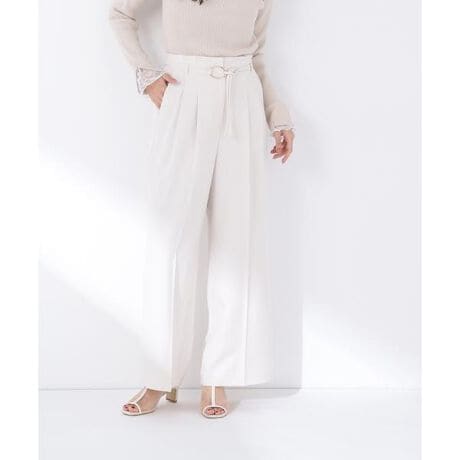 ニュアンスカーブのメタルバックル付き共布ダブルベルトがポイントのワイドパンツ。共布ベルトはきゅっと一つ結びにして、ベルト先を垂らすのがおすすめです。後ろウエストはゴム仕様でストレスフリーなはき心地。センタープレスが入っているタックワイドシルエットで、スタイルアップ効果を期待できます。<素材>さらっとしたタッチの合繊ツイル素材を使用。シワになりにくい素材感です。オフホワイトカラーのみ裏地つきです。<詳細>仕様・前ファスナー裏地・オフホワイトカラーのみあり透け感・なし / 光沢・なし / 伸縮性・ややあり生地の厚さ・普通※モデルの着用画像の場合、光の当たり具合により、実際の色味と異なって見えることがございます。色味は、商品単体の画像をご参照ください。
