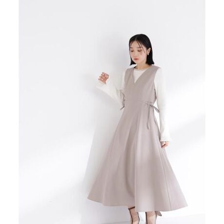 ウエストサイドの細リボンが華奢なアクセントのジャンスカ。胸元のカーブラインが柔らかい印象に見せてくれます。中はブラウスやニットプルオーバー合わせもおすすめ。フィット&フレアシルエットで幅広い体型に合わせやすく、ウエスト位置が高めなのでスタイルアップも叶えます。<素材>落ち感と肉感のあるキレイめ素材を使用しています。<詳細>仕様・後ろファスナー裏地・あり透け感・なし / 光沢・なし / 伸縮性・なし生地の厚さ・普通※モデルの着用画像の場合、光の当たり具合により、実際の色味と異なって見えることがございます。色味は、商品単体の画像をご参照ください。