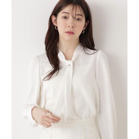 ボウタイの中央にきらりと輝くピンをあしらった上品ブラウス。タイ部分はピンで固定されているため、動いてもよれにくく安心して着用いただけます。袖口内側はシャーリングゴムでフィット。ハンサムすぎず程よく女性らしさを残したデザインで、スカートにもパンツにも合わせやすいです。※ピン先が鋭いためお取り扱いにご注意ください。