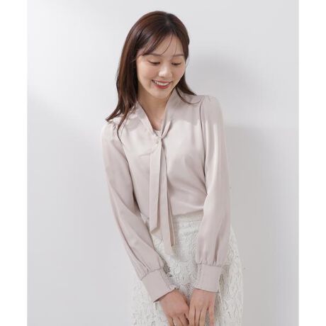 ボウタイの中央にきらりと輝くピンをあしらった上品ブラウス。タイ部分はピンで固定されているため、動いてもよれにくく安心して着用いただけます。袖口内側はシャーリングゴムでフィット。ハンサムすぎず程よく女性らしさを残したデザインで、スカートにもパンツにも合わせやすいです。※ピン先が鋭いためお取り扱いにご注意ください。