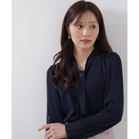 ボウタイの中央にきらりと輝くピンをあしらった上品ブラウス。タイ部分はピンで固定されているため、動いてもよれにくく安心して着用いただけます。袖口内側はシャーリングゴムでフィット。ハンサムすぎず程よく女性らしさを残したデザインで、スカートにもパンツにも合わせやすいです。※ピン先が鋭いためお取り扱いにご注意ください。