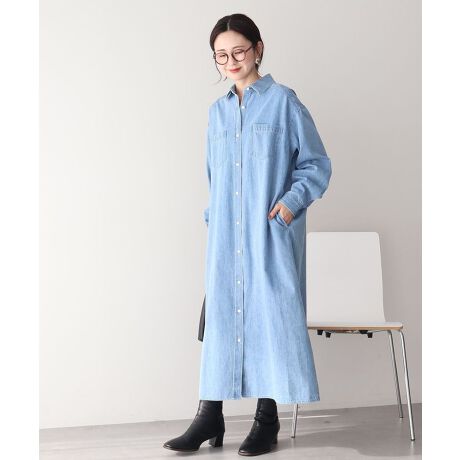 長めの着丈とクリーンなデザインでカジュアル過ぎない上品さを演出するデニムワンピース。
