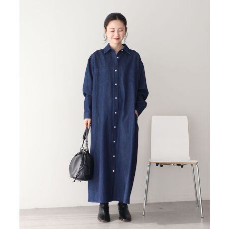 長めの着丈とクリーンなデザインでカジュアル過ぎない上品さを演出するデニムワンピース。
