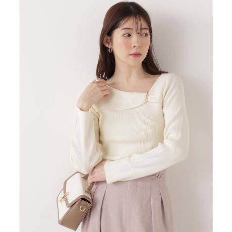 人気アイテムを春らしくアップデート!アシンメトリーディテールが特徴のリブニットです。今回は新鮮な春カラーを揃え、アシンメトリーな襟元には金色バーを付けて大人っぽく仕上げています。スカートでもパンツでも好相性、デイリーに着回せるデザインです。