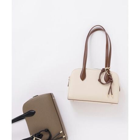 バッグチャーム付きで洗練された印象に見せてくれる、トレンドのフェイクスウェード素材を使用したボストンバッグ。2本の異なる形状のカラナビを、バッグのハンドル1本につけたり、ハンドルからハンドルに渡るようにつけるなど、雰囲気を変えて楽しめます。バッグの持ち手は長めなので、厚手のアウターの上からも肩にかけやすくなっています。<素材>コットンキャンバス風の表面感のある型押しフェイクレザーをボディに使用し、ハンドルやチャームにはしっとりさらっとした質感の表革風のフェイクレザーを使用しています。※モデルの着用画像の場合、光の当たり具合により、実際の色味と異なって見えることがございます。色味は、商品単体の画像をご参照ください。