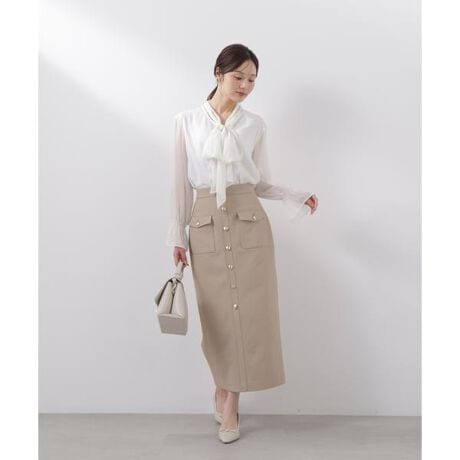 Iラインのナローシルエットが女性らしさを引き立てるスカート。フロントボタンが縦のラインを強調し、すっきり見えを叶えます。フロントボタンは飾りなので安心して着用いただけます。