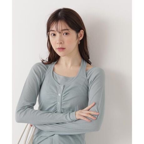 ホルターネックタンクトップと長袖カットソーのセットアップ。シアー感のある滑らかで肌触りの良い生地を使用しています。デコルテがキレイに見えるデザインで、女性らしさを演出。体にフィットする伸縮性のあるデザインが細見えを叶えてくれます。
