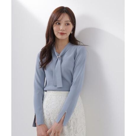 フラットな総針編みのボウタイニット。パール調リングは取り外し可能で、ボウタイをひと巻きして垂らすと雰囲気の変化を楽しめます。ボウタイタイのリングは、少し寝かせ気味で装着するのがおすすめ。袖口はスリット入り、手首に抜け感を作りながら、きらっとパーツがフェミニンなアクセントになります。