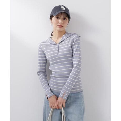 ボタンを2つ開けると、顔まわりがすっきり見えて小顔効果も期待できるビッグカラーリブニット。多めに付けたパール調ボタンが華やかなアクセントになり、ボーダー柄が程よくカジュアルな印象をプラス。スカートにもパンツにも合わせやすく、幅広いスタイリングが楽しめます。