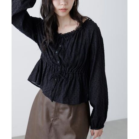 襟ぐりリボンとフリルディテールが華やかで可愛らしいペプラムブラウス。からみ織りとドビー織りを組み合わせた、凹凸感が特徴のカラミドビー生地を使用。ふんわりと軽やかな生地感ながら、ウエストマークでスタイルアップが叶います。一枚で着るのはもちろん、長袖インナーとレイヤードしたり、前開きで羽織りとしても長い期間着回せます。※モデルの着用画像の場合、光の当たり具合により、実際の色味と異なって見えることがございます。色味は、商品単体の画像をご参照ください。