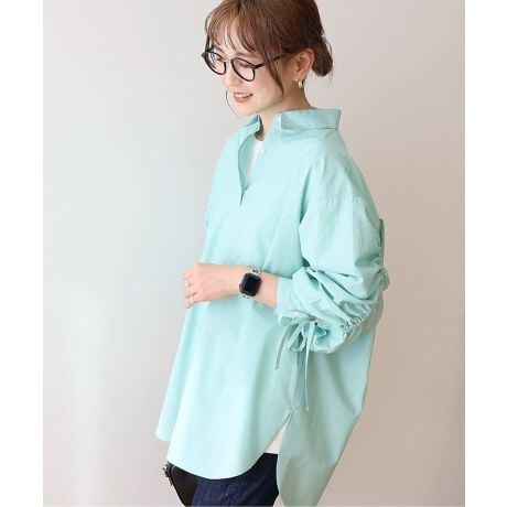 カジュアルなイメージのシャツでありながらもバックから袖にかけてギャザーを施しリボンディテールで甘さを加えたフェミニンな一着。