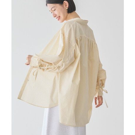 カジュアルなイメージのシャツでありながらもバックから袖にかけてギャザーを施しリボンディテールで甘さを加えたフェミニンな一着。