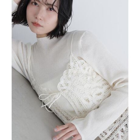 クラフト感のある贅沢なバテンレースを使用したキャミビスチェ。曲線とハシゴレースを組み合わせた、オリジナルのレース柄を使用しています。肩とフロント開きにはデシンの細い丸紐を使い、華奢でフェミニンな印象に。インナーに合わせるのはハイゲージニット、暑い時期にはTシャツとのカジュアルなレイヤードスタイルがおすすめです。フロントの丸紐で着脱いただけます。<素材>手仕事による刺しゅうをあしらった贅沢なバテンレースを使用。一枚一枚手作業で作られているため、若干の個体差や糸の飛び出しなどがある場合がございますが、その風合いも含めてクラフト感が特徴的なアイテムとなります。繊細な素材のためひっかけ等にご注意ください。<詳細>仕様・前ヒモ裏地・なし透け感・あり / 光沢・なし / 伸縮性・なし生地の厚さ・薄手※モデルの着用画像の場合、光の当たり具合により、実際の色味と異なって見えることがございます。色味は、商品単体の画像をご参照ください。