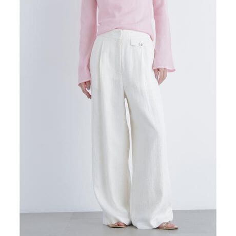 シンチバックとフロントのメタルボタンがポイントのワイドパンツ。後ろベルトゴム仕様でリラクシーなはき心地、シンチバックでややサイズ調整も可能です。フロントの飾りフラップポケットがアクセント。麻を含んだナチュラルな素材感でスタイリングをアップデートしてくれます。<素材>ナチュラルなシワ感が特徴の麻を含んだ素材を使用。リラクシーかつこなれ感のある素材で、オフホワイトカラーは麻らしいベージュの節が入っています。<詳細>仕様・前ファスナー裏地・あり透け感・ややあり / 光沢・なし / 伸縮性・なし生地の厚さ・薄手※モデルの着用画像の場合、光の当たり具合により、実際の色味と異なって見えることがございます。色味は、商品単体の画像をご参照ください。
