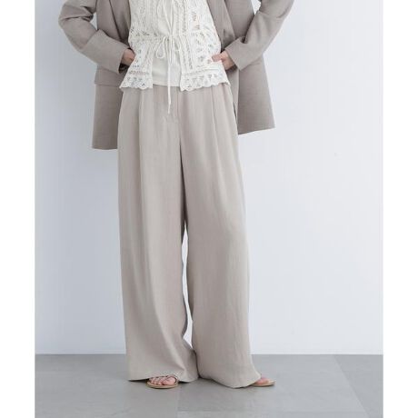 シンチバックとフロントのメタルボタンがポイントのワイドパンツ。後ろベルトゴム仕様でリラクシーなはき心地、シンチバックでややサイズ調整も可能です。フロントの飾りフラップポケットがアクセント。麻を含んだナチュラルな素材感でスタイリングをアップデートしてくれます。<素材>ナチュラルなシワ感が特徴の麻を含んだ素材を使用。リラクシーかつこなれ感のある素材で、オフホワイトカラーは麻らしいベージュの節が入っています。<詳細>仕様・前ファスナー裏地・あり透け感・ややあり / 光沢・なし / 伸縮性・なし生地の厚さ・薄手※モデルの着用画像の場合、光の当たり具合により、実際の色味と異なって見えることがございます。色味は、商品単体の画像をご参照ください。