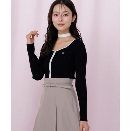 昨年人気だったデザインを今年らしくアップデート!ハート型のロゴプレートを使用したチョーカー付きリブニット。今年は襟ぐりをほんのりスクエアネックにし、バイカラーの黒が仲間いり。ニットチョーカーがアクセントになります。フェミニンにもカジュアルにも好相性、ボトムスを選ばない万能リブニットです。※撮影時照明の関係により、色味が違って見える場合がございます。またパソコン・スマートフォンなどの環境により、若干製品と画像のカラーが異なる場合もございます。予めご了承ください。商品の色味は、商品単品画像をご参照下さい。※商品画像はサンプルのため、色味やサイズ等の仕様に変更がある場合がございますので、予めご了承ください。