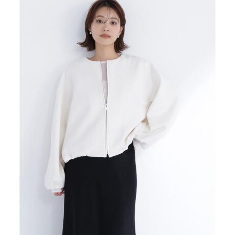 裾はドロスト仕様でシルエットの変化を楽しめるブルゾン。シルバーパーツのファスナーとスピンドルで統一し、洗練された印象に仕上げています。袖口にタックを入れて立体感のあるフォルムを演出。ノーカラーなのでハイネックやシャツ襟とのレイヤードも映えるアウターです。<素材>程よいハリ感のあるダンボール素材を使用しています。<詳細>仕様・前ファスナー裏地・なし透け感・なし / 光沢・なし / 伸縮性・あり生地の厚さ・普通※モデルの着用画像の場合、光の当たり具合により、実際の色味と異なって見えることがございます。色味は、商品単体の画像をご参照ください。