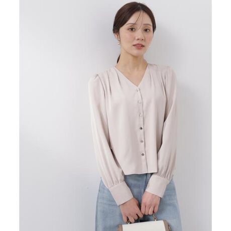 フロントと袖口カフスの金色ボタンが上品な印象のキレイめブラウス。襟元のタックがシャープな印象で、顔まわりをすっきり見せてくれます。シンプルなパンツやフェミニンなスカートはもちろん、カジュアルなデニムスタイルにも着回せます。