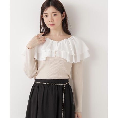 ボリューム感のあるラッフルが目を引くリブニット。さらっとしたデシン素材のラッフルが春らしく、異素材の組み合わせで軽やかな印象に。さり気ない配色デザインが上品さと存在感をプラスします。スカートはもちろん、デニムなどのパンツスタイルにも活躍してくれます。