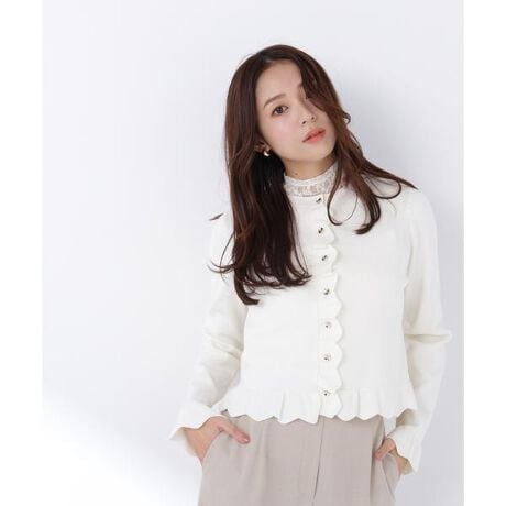 上品な輝きを放つメタルボタンとフェミニンなフリルをあしらったカーディガン。羽織るだけでコーディネートに華やかさをプラスし、シンプルな装いも一気に旬顔に見せてくれます。程よい厚みとやわらかな肌触りで、季節の変わり目にもおすすめです。<素材>柔らかい肌触りのキレイめな総針編みニットです。<詳細>仕様・前ボタン裏地・なし透け感・なし / 光沢・なし / 伸縮性・あり生地の厚さ・普通※モデルの着用画像の場合、光の当たり具合により、実際の色味と異なって見えることがございます。色味は、商品単体の画像をご参照ください。