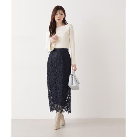 春らしいケミカルレースを使用したオリジナル柄のタイトスカート。花柄の繊細な女性らしさを残しつつ、程よくシャープな印象を加えて大人の可愛さを演出。体のラインを拾いすぎない上品なタイトシルエットです。爽やかで春らしいエクリュカラーとベージュ、大人っぽくシャープなネイビーの3色展開です。
