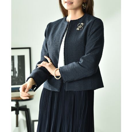 クリア仕上げで表面感をすっきりさせたツィードノーカラージャケット。デザインは極限までシンプルにし、着やすさを重視しました。さりげないラメがアクセントに◎袖口は女性らしいスリットを施し、手元を綺麗に魅せてくれます。フロントはホックの仕様で、前を開けたままでもすっきり羽織れます。