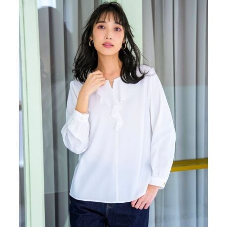 ・一枚で着映えるフリルデザインがポイントのブラウス・普段着や通勤着などオンオフ活躍・フロント部分のバーパーツがアクセントになり、ネックレスをしなくても華やかな印象・トップスをIN・OUTどちらでも決まる程よい着丈・ジャケットとのスタイリングが決まる様、フリルの幅や位置にこだわっています