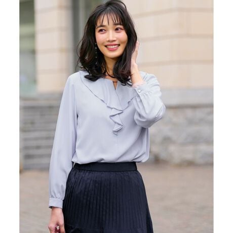 ・一枚で着映えるフリルデザインがポイントのブラウス・普段着や通勤着などオンオフ活躍・フロント部分のバーパーツがアクセントになり、ネックレスをしなくても華やかな印象・トップスをIN・OUTどちらでも決まる程よい着丈・ジャケットとのスタイリングが決まる様、フリルの幅や位置にこだわっています