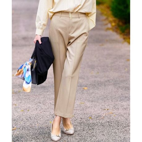 ・テーパードのきちんと感とセミフレアの女性らしいこなれ感、両方をバランスよく取り入れたNEWシルエットが初登場・ありそうでなかった、ちょうどいい形がいつものパンツコーデをさりげなく今どきにアップデート・穿くだけで自然と脚長に、ひざや腰の位置まで高く見えるようこだわった一本・程よい裾幅で、ヒールはもちろんスニーカー合わせも綺麗に決まる・高め位置から入ったセンタープレスで、きちんと感と美脚見え効果も狙える・ほどよくゆとりのあるサイズ感・フロントのバーデザインがベルトなしでもポイントに・きれいな折山が長く続くクリース加工済み(前側のみ)