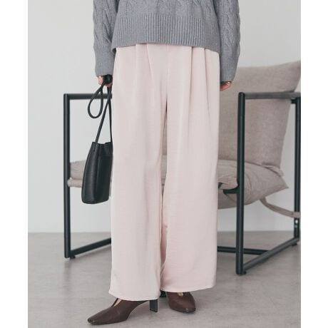 光沢のあるサテン素材で仕立てたフェミニンなパンツ。レッグラインを拾いにくいゆとりのあるシルエットですっきり華奢見えを叶えます。バックウエストのみゴム仕様で楽な穿き心地ながら、タックインスタイルが美しく決まるのも嬉しいポイント。合わせ方次第でロングシーズン活躍するおすすめのアイテムです。透け感[ややあり]