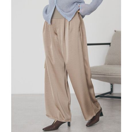 光沢のあるサテン素材で仕立てたフェミニンなパンツ。レッグラインを拾いにくいゆとりのあるシルエットですっきり華奢見えを叶えます。バックウエストのみゴム仕様で楽な穿き心地ながら、タックインスタイルが美しく決まるのも嬉しいポイント。合わせ方次第でロングシーズン活躍するおすすめのアイテムです。透け感[ややあり]