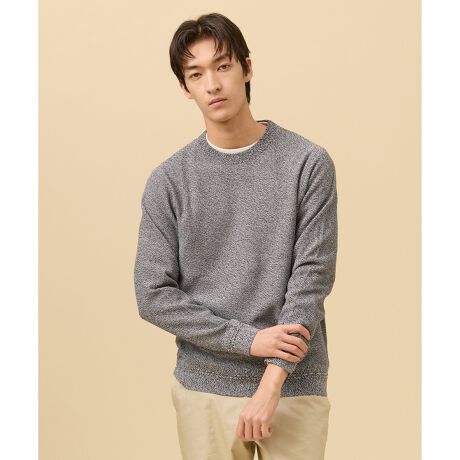 ■素材綿100%の糸を使用。擬麻加工という特殊な樹脂で糸をコーティングし、麻に似せた雰囲気にする加工を施しています。加工された糸の風合がまるで麻糸のようにドライタッチになることが特徴です。また、濃淡の2色の糸を撚糸して、コントラストのあるユニークな糸で編立ています。全体を細かいカノコ柄で編立ていますので、素材特性も相まって清涼感のある着心地に仕上がっています。