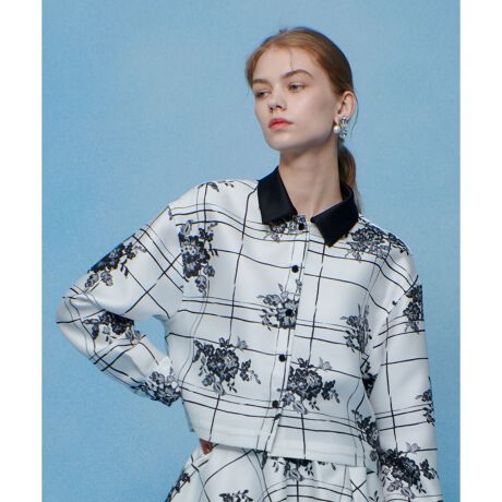 イタリアのコモにあるSilk-co(シルク コー)社のインポート生地。張りと美しい艶のあるハードめな素材にモノトーンの格子とレースのお花が繊細に描かれています。ホワイト&BKの配色でクリアーな印象。ゆったりとしたサイズ感のシャツデザイン。衿は厚手の黒いサテンを使用する事で全体を引き締めてくれます。前開きで、季節が進めば羽織としても活躍します。同素材のスカートとセットアップコーデもお勧めです。