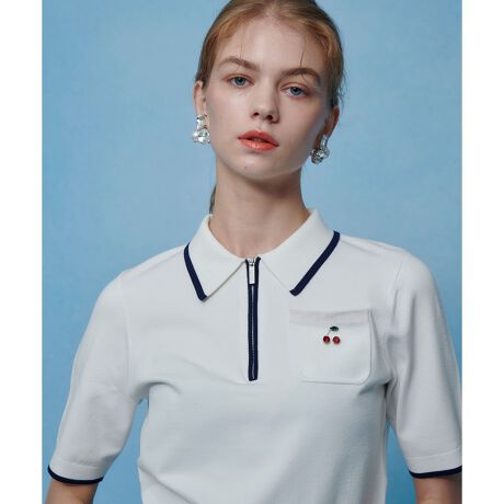しなやかなレーヨン混の素材に、ラインストーンとビーズで、シーズンテーマのチェリーを飾りました。少しだけスポーツマインドを取り入れて細いラインをアクセントにしたハーフジップポロ。ミニマムなシルエットなので、ワイドなボトムもすっりバランスアップします。