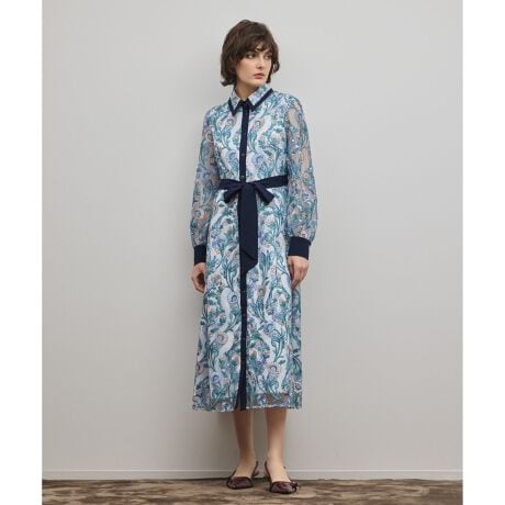 [型番:0126135210]7色の糸を使用した優しい配色のシャーベットカラーのフラワー刺繍。フレアシルエットで、衿の配色ラインがアクセントです。ウエストベルト付。※こちらのモデル着用画像はサンプル品を撮影しております。実際の商品と仕様、加工、サイズが若干異なる場合がございます。予めご了承くださいませ。