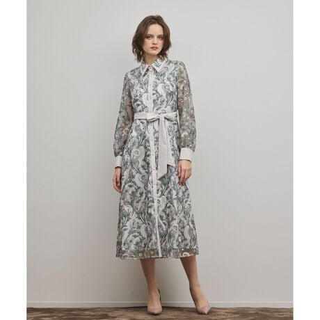 [型番:0126135210]7色の糸を使用した優しい配色のシャーベットカラーのフラワー刺繍。フレアシルエットで、衿の配色ラインがアクセントです。ウエストベルト付。※こちらのモデル着用画像はサンプル品を撮影しております。実際の商品と仕様、加工、サイズが若干異なる場合がございます。予めご了承くださいませ。