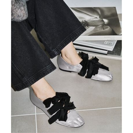 サテンリボンに1点1点手作業でほつれ加工を施し、ヴィンテージ調に仕立てたバレリーナシューズ。