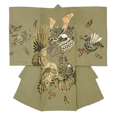雄々しい鷹や兜は金駒刺繍で縁取られ、軍配や刀、弓矢などが描かれたレトロモダンなデザインです。