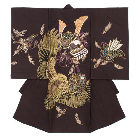 雄々しい鷹や兜は金駒刺繍で縁取られ、軍配や刀、弓矢などが描かれたレトロモダンなデザインです。