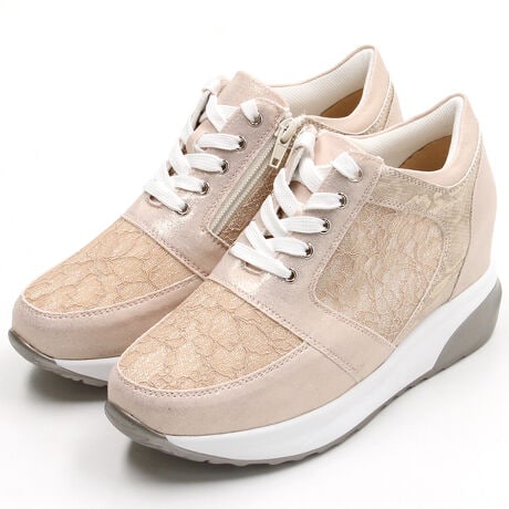 [型番:XJ152]チュールレースサイドファスナーインヒールスニーカー人気モデルの春夏バージョンがサイズピッチになって新登場!【おすすめPOINT】・インソールは全面5mmの低反発クッションを使用・ヒール高4.0cm+インヒール3.0cm入りで脚長効果◎・サイドファスナーの開閉で脱ぎ履きできます・春夏らしい透け感のあるチュールレースがかわいい・チュールレース×ヘビ柄のカワカッコイイ新鮮な組み合わせ
