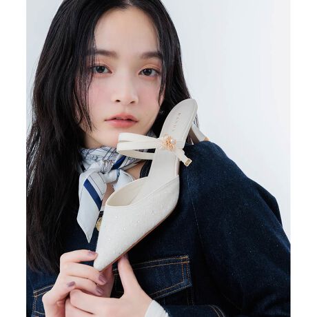 上品なモノグラムパールがポイントのミュールパンプス。