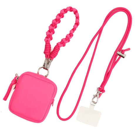スクエア型のポーチにハンドストラップやチェーンショルダー、スマホ取り付け用シートなどが付いていて組み合わせでマルチに使えるポーチです。