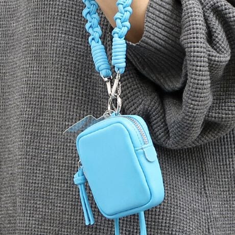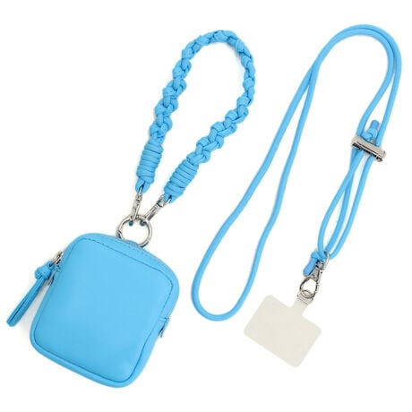 スクエア型のポーチにハンドストラップやチェーンショルダー、スマホ取り付け用シートなどが付いていて組み合わせでマルチに使えるポーチです。