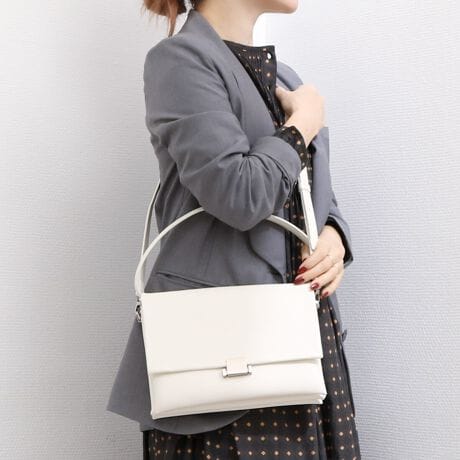 ツヤ消しのシルバー金具がクールなアクセントになり、大人女性の洗練されたカジュアルスタイルにぴったりです。