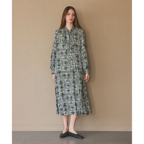 [型番:0226131017]【Japan Fabric】表面の梨地ではなく、敢えて裏面の程良い光沢感のサテンにヴィンテージから起こしたグレンチェックをプリント。共布のリボンを衿で結んでボウタイにしたり、ウエストのベルトにしたり、3WAYで着られるAラインシルエットのワンピース。※こちらのモデル着用画像はサンプル品を撮影しております。実際の商品と仕様、加工、サイズが若干異なる場合がございます。予めご了承くださいませ。