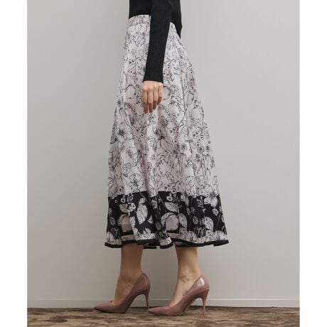 繊細な線画調のフルーツフラワーのプリントをした薄手のサテン素材。裾の配色が特徴の、タックフレアスカート。